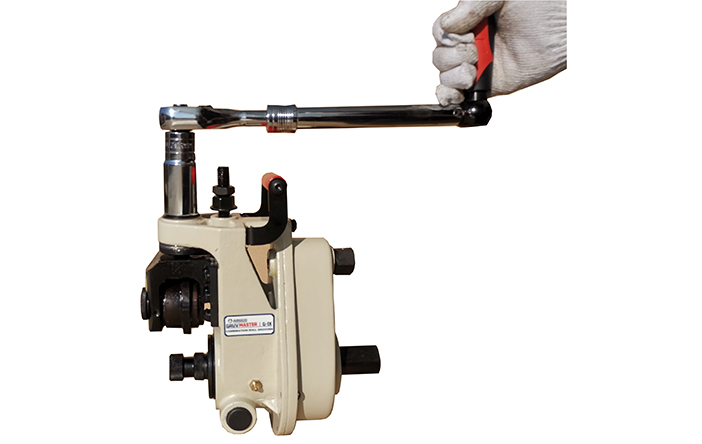 六、 檢查棘輪扳手和可調(diào)節(jié)手柄是否正常運(yùn)行。確保棘輪扳手在兩個(gè)方向上都可以平穩(wěn)一致地運(yùn)行。棘輪扳手應(yīng)牢固鎖定到位。棘輪扳手還應(yīng)牢固地鎖定在可調(diào)節(jié)手柄中,并且牢固地鎖定在滾槽機(jī)背面的手動(dòng)驅(qū)動(dòng)螺母上。